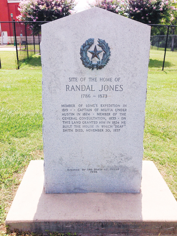 In 1818, Jones traveled to Galveston to meet with Jean Laffite about purchasing slaves to sell in Louisiana. Before he could embark on this enterprise, Jones became associated with Dr. James Long’s attempt to seize Texas. After Dr. Long’s death, Randal and his brother James escorted Jane Long to San Antonio in 1822 to ask for support after the death of her husband. Later that year he came to Austin’s Colony, settling near the fort in the bend after spending about a year at San Felipe. Randal received a league on the north side of the Brazos at the bend where he raised cattle, and a labor on the other side of the river south of the bend where he made his home. Deaf Smith passed away there in 1837 and Wyly Martin did the same in 1842. Randal was friends with many of the early settlers.