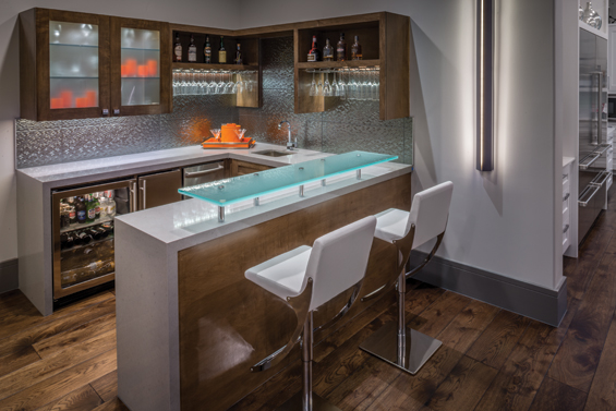 Waterfall edges, a floating counter, frosted glass, open shelving and an artsy vertical sconce make this bar a contemporary space.