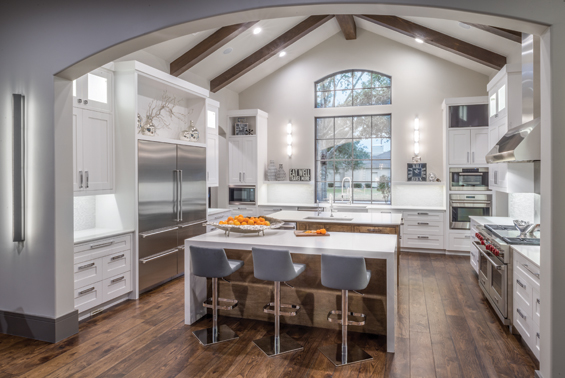 This bright, white kitchen features two islands – the back one for prep and the front for service and seating. The high ceiling is defined with wood beams that match the floor, and natural light makes it all the more inviting.