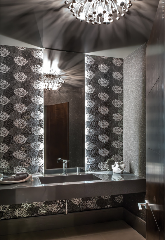 Changing out the light fixtures made a big impact on the redesign. Where a Mediterranean home may have highly embellished fixtures made of burnished bronze or wrought iron, the lights in a modern home design will have strong linear, geometric shapes with little embellishment. For example, the owners chose a clean, rectangular shape to illuminate the entry. In the master bath and her closet, Sputnik-style chandeliers enhance the modern vibe. Another ultra-modern detail in the master bath is the use of electric mirrors on top of the mirrors over both his and her sinks and at her makeup mirror, instead of more traditional sconces – a choice that cleans up and simplifies the silhouette of the space. The dining room chandelier, custom-designed by an Israeli designer, features lighted crystal pendants hung at varying lengths to create a stunning work of contemporary art and light.