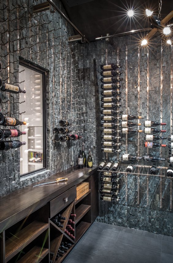 Black quartzite on the walls, interesting lighting and a unique wine display make for a modern wine vault.