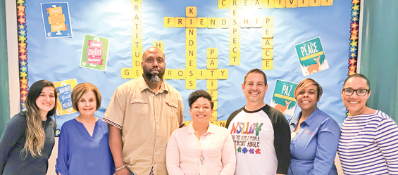 (L-R): Child Advocates of Fort Bend Forensic Interviewer Heather Rashid, Collaborative Family Engagement Coach Jackie Townsend, WINGS Volunteer Supervisor Leroy Hodge, Arizona Fleming Elementary School Counselor Destiny Parker, Arizona Fleming Elementary School Principal Jason Soileau, CASA Program Director Metoyer Martin and Volunteer Services Team Leader Casey Davis.