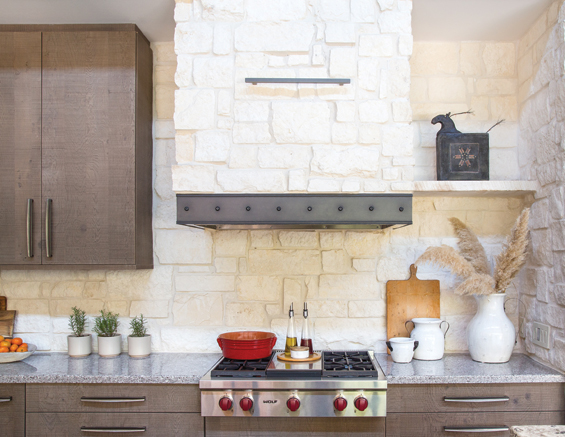 Austin limestone defines the kitchen backsplash and encloses the vent hood above the range.