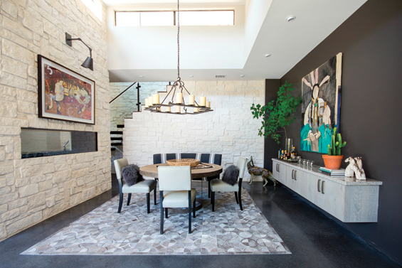 Working side by side, the owner and her team broke ground on the project in Spring 2014. In order to use as little sheetrock as possible, they opted for natural materials – metal, wood and stone (the home is 80 percent stone). Austin limestone is installed on many of the walls, along with forged steel. On the floors, concrete is juxtaposed with hand-rubbed European white oak floors. Custom-designed steel lighting and matte black finishes flow from room to room and bring cohesion. Three working fireplaces enhance the rustic vibe.