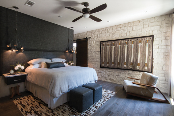 The home includes two full master suites. The owner’s master suite is located downstairs and incorporates white stone walls, a charcoal gray leather upholstered headboard wall and a working fireplace. Two unique hanging pendants over each floating night stand give this space a warm, cozy lodge feel.