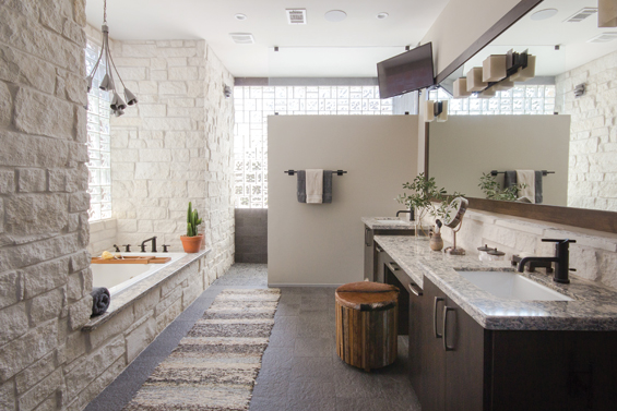 A custom barn door leading into the master bathroom is made of white oak and stained in a rich ebony tone. The bath’s custom vanity is designed for two and uses the same Austin limestone found throughout the rest of the home, this time paired with split-faced charcoal gray porcelain tile and glass brick windows with a random pattern, and accented with matte black finishes.