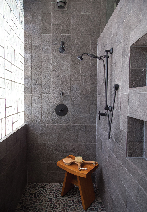 The master shower, designed with spaciousness in mind, includes split-faced, charcoal gray porcelain tile, a pebble floor and matte black plumbing finishes .