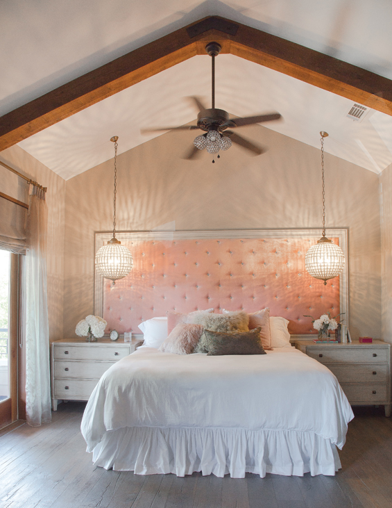 This chic girl’s room includes a custom, pink velvet headboard with rhinestone tufting and crystal chandeliers from Restoration Hardware. Bedside tables by Hooker Furniture; bedding/accessories by Restoration Hardware and High Fashion Home.