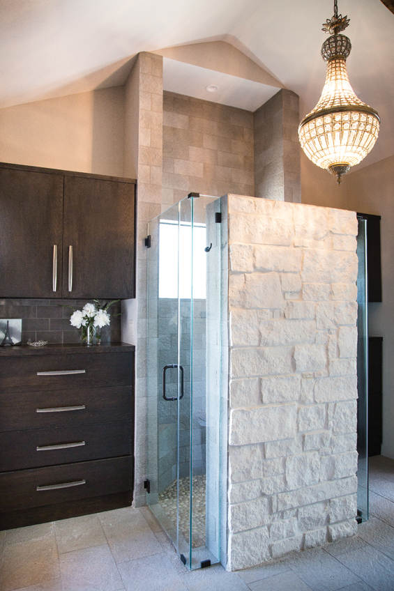 The secondary bath features a shower surround in Austin limestone, gray split-faced porcelain tile, crystal chandeliers from Restoration Hardware and custom ebony-finished cabinets.