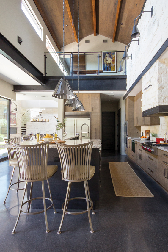 This rustic, contemporary kitchen sits along a massive wall of white Austin limestone. Wood-Mode cabinets by Cabinet and Designs, Inc.; custom steel banding and wall sconces by L Design Group, fabricated by Peck & Company; kitchen pendants by Hubbardton Forge; leather and metal bar stools by Cantoni Leather.