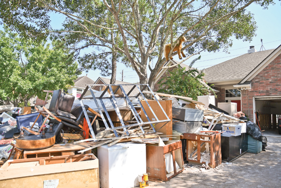 A common sight in the Canyon Gate community after flooded streets: virtually everything from the house was in the trash pile. Note the stuffed animal left in the trees by high water.