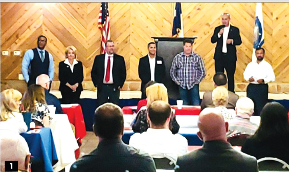 1) (Standing, l-r): Lewis White, Legal Counsel; Linda Howell, Secretary; Todd Schuh, Parliamentarian, Carlo Jimenez, Vice Chairman; Jason Walker, Vice Chairman; Jacey Jetton, Chairman, Manish Seth, Treasurer.